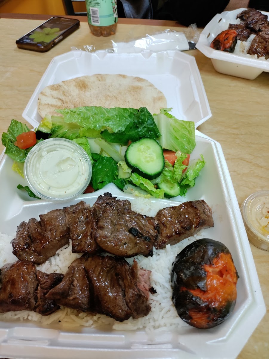 One of the standout dishes on the menu is the Chicken and Beef Plate. This hearty meal features tender, perfectly seasoned chicken and beef, served with a side of rice and fresh vegetables. It’s a great option for those who want to enjoy both flavors in one satisfying meal. If you're in the mood for something even more indulgent, the Beef Kabobs are a must-try. These skewers are grilled to perfection, offering a smoky, charred flavor that pairs beautifully with the restaurant's homemade sauces.